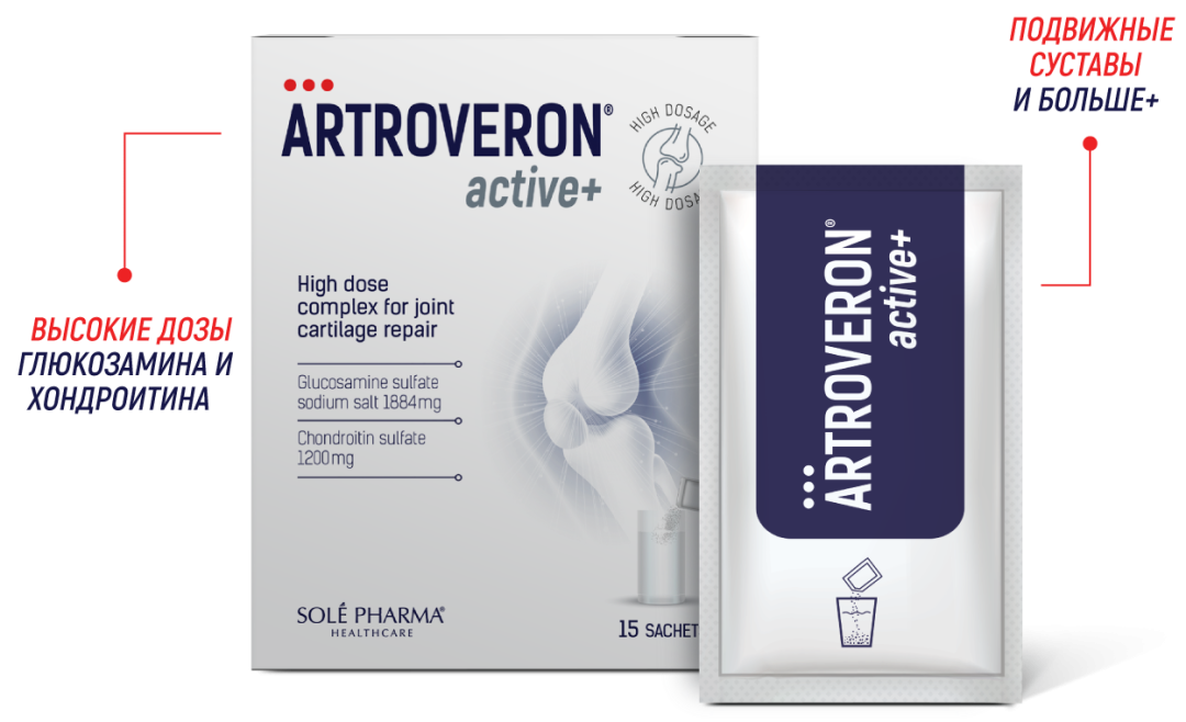Artroveron® Active+ — это медицинский комплекс глюкозамина сульфата и хондроитина сульфата в высоких дозах, который помогает восстановить суставной хрящ и поддерживает здоровье суставов, чтобы вы могли продолжать заниматься любимыми повседневными делами без боли и дискомфорта.